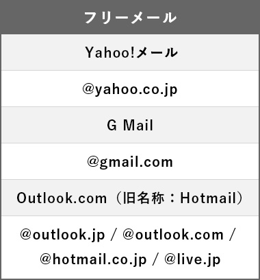 以下のような、フリーメールアドレスや携帯電話の
